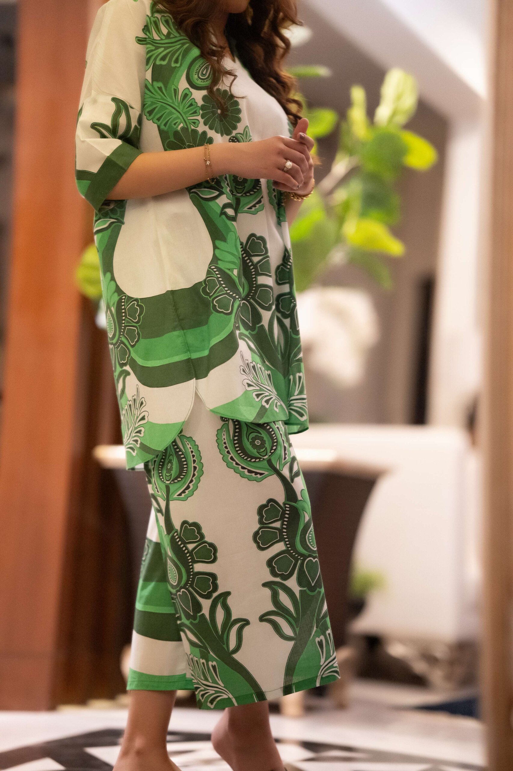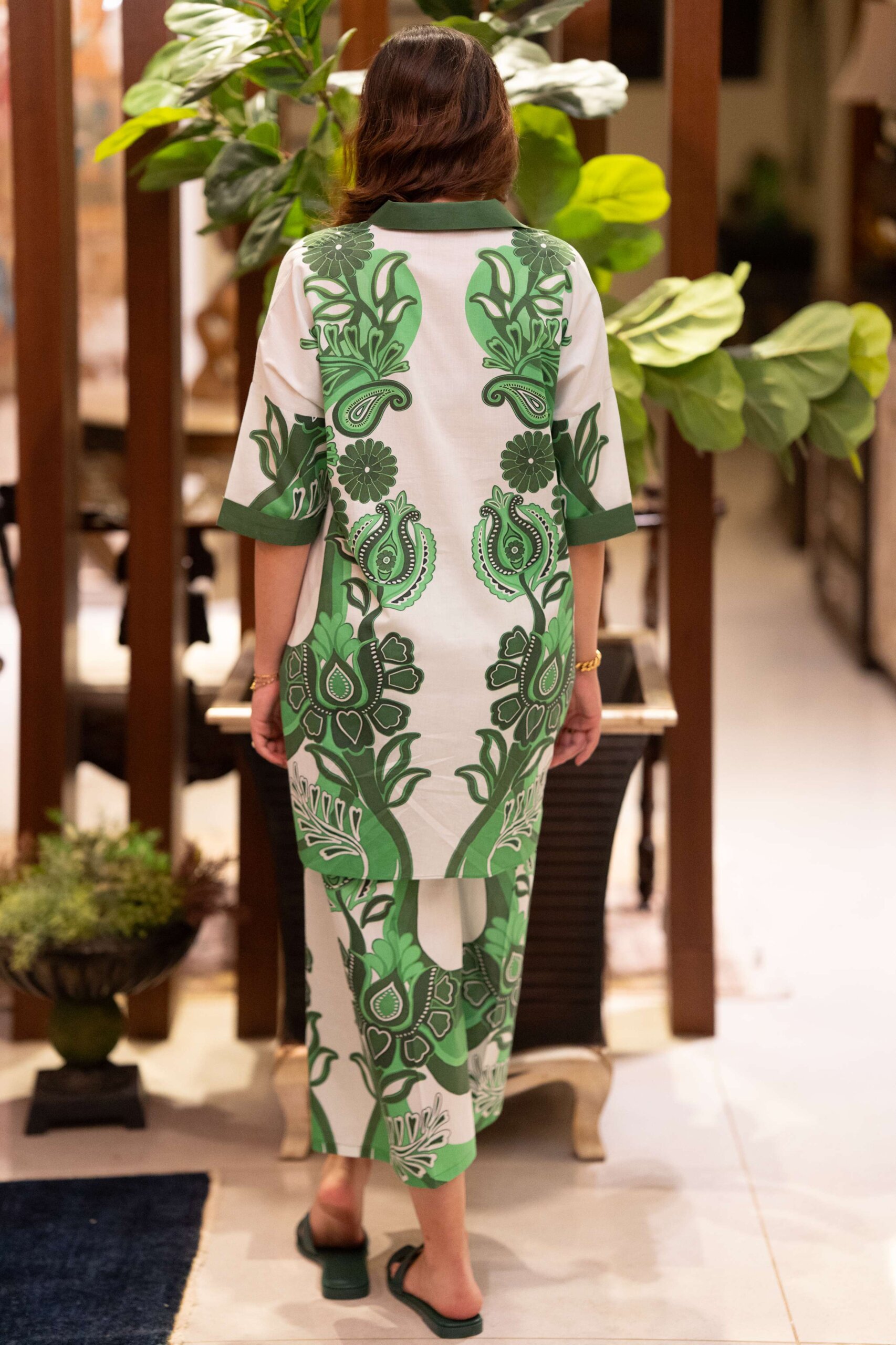 An earthy cotton co-ord inspired by traditional Mexican Aztec motifs, rendered in calming green tones. Balanced, soulful, and effortlessly grounded, it celebrates heritage with modern ease.