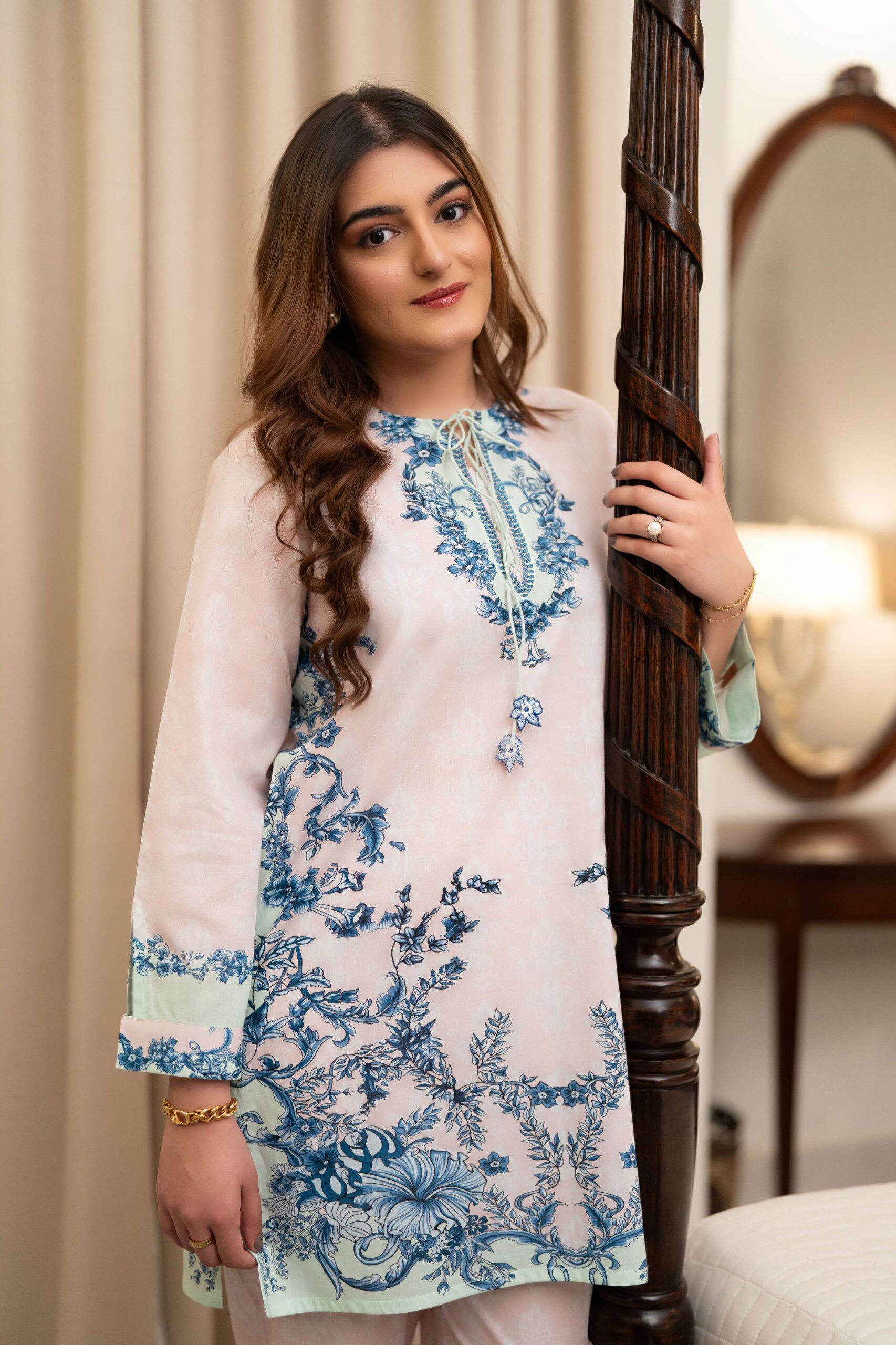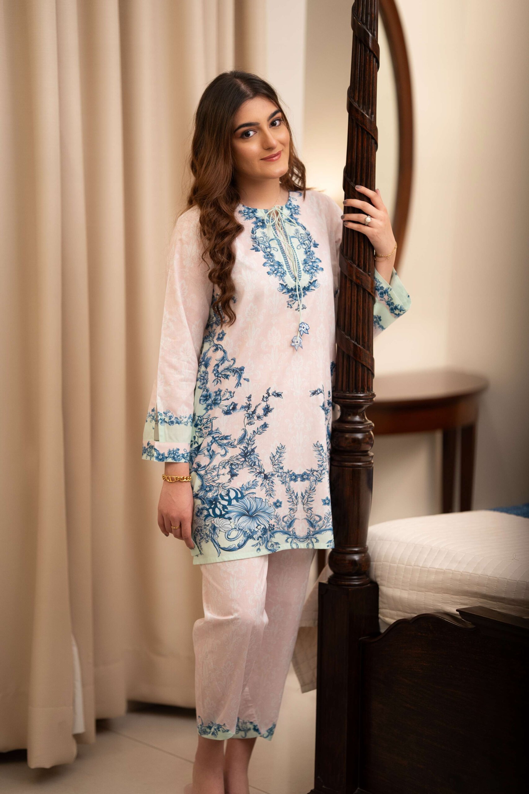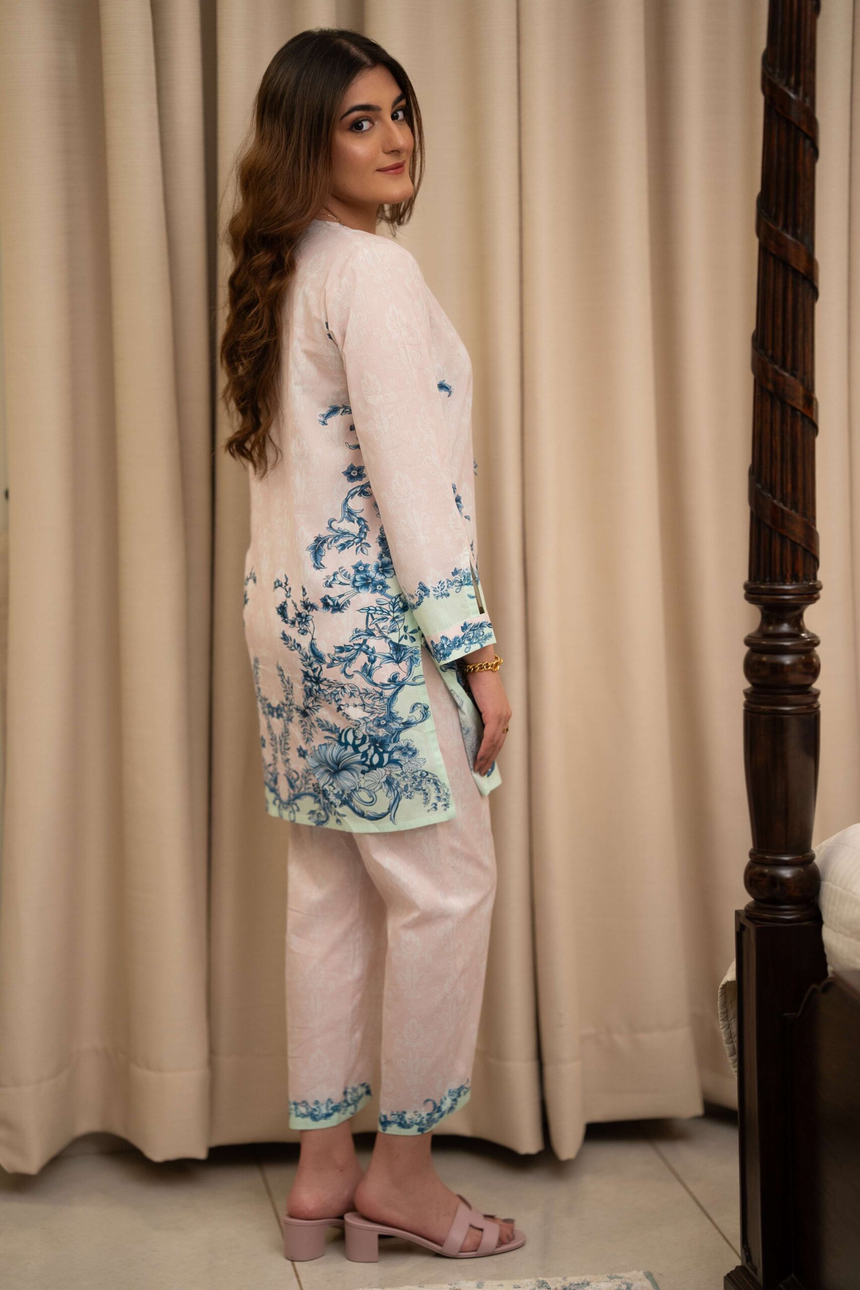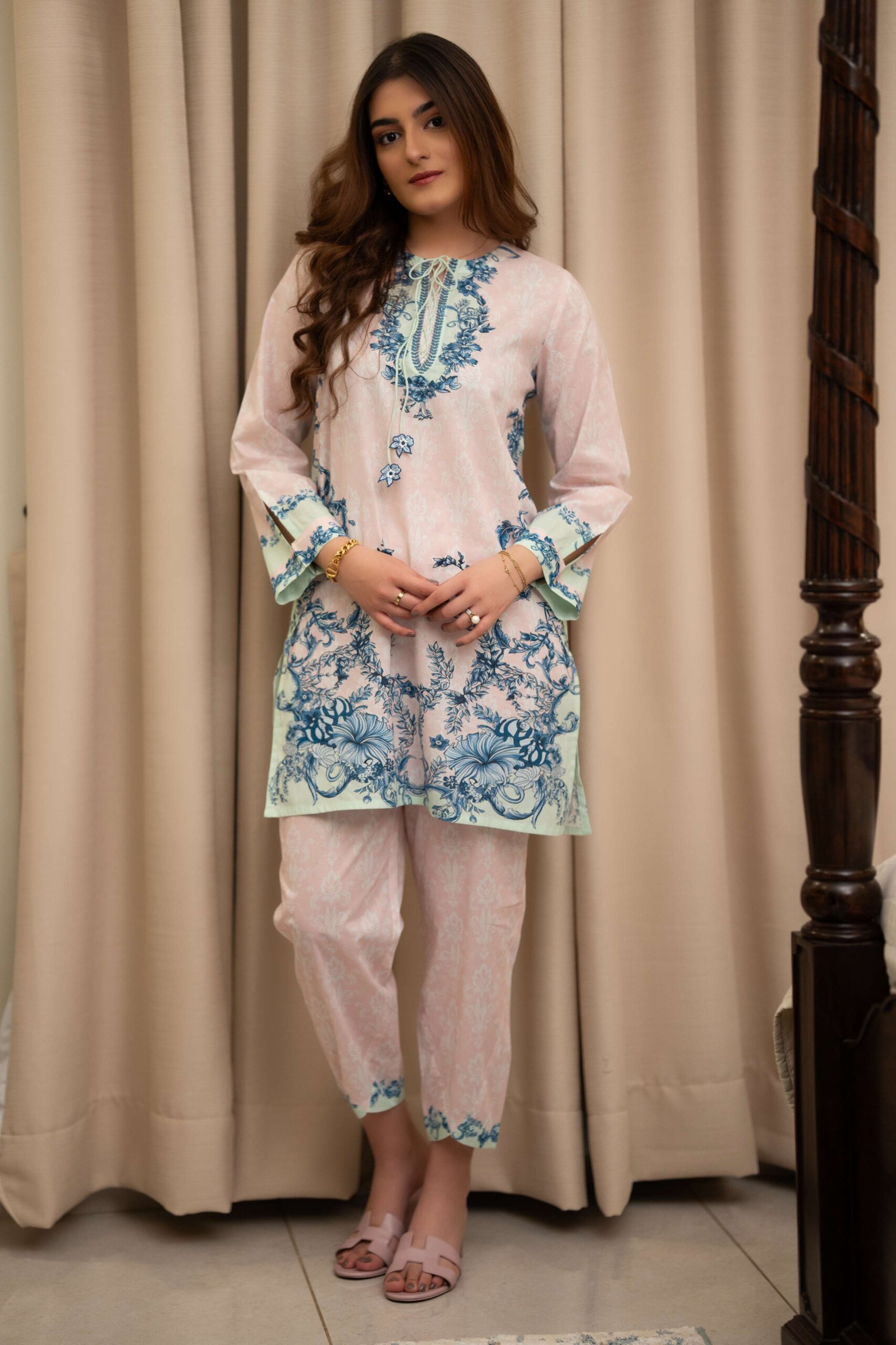 A delicate cotton co-ord inspired by blooming English gardens, featuring pale pink, mint, and whisper-soft blue florals. Romantic, graceful, and quietly enchanting.
